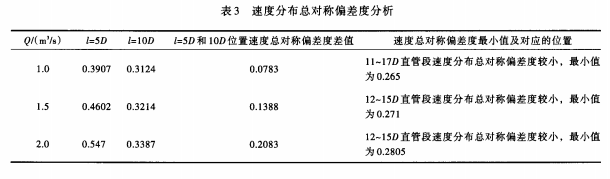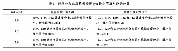 4.1.3 800mm內徑電磁流量計測量管路設計分析 根據(jù)上述計算結果統(tǒng)計出不同過流量、不同直管長度,速度分布總對稱偏差度的*小值及對應的位置,見表2。從表2可以看出,當直管長度L取12m和14.4m時,均有部分位置的速度分布總對稱偏差度較小,且兩種直管長度下總對稱偏差度*小值相差很小。以Q=2.0m3/s為例,L取12m和14.4m時,總對稱偏差度*小值分別為0.3212和0.3198,差值為,0.0014。由此可見,當測量直管長度達到一定值時,繼續(xù)延長測量直管長度并不能顯著改善管內速度的軸對稱分布情況。