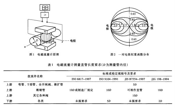 盡管電磁流量計生產廠家不斷追求流量計本身的精度,電磁流量計的設計和工藝技術在不斷提高,但實際測量中,工藝管道中的彎管、閥門等都會引起流動畸變、二次流或漩渦,水流只有經過相當長的直管,管內流速才能呈中心軸對稱分布。對電磁流量計上、下游直管長度的要求是保證流速呈中心軸對稱分布,獲得儀表測量精確度的必要條件之一。各標準或檢定規(guī)程提出了電磁流量計所要求的上、下游直管長度,如表1所示,要求比通常要求高,這是為了保證達到0.5級精度儀表的要求。ISO6817—1997是電磁流量計應用標準,該標準規(guī)定,對任何類型的擾流件,電磁流量計上游至少應有10D(測量管內徑)長度的直管,性能變動才能保證不超過1%。ISO9104—1991是電磁流量計性能評定標準,JJG198—1994是我國速度流量儀表通用檢定規(guī)程,雖然也適用于電磁流量計,但較簡單,而ISO9104—1991比較詳細。