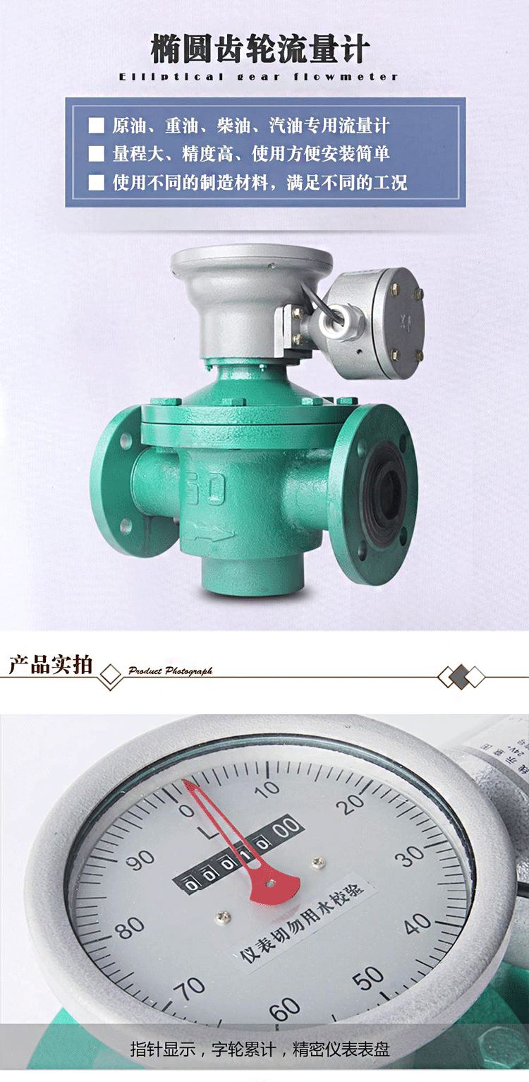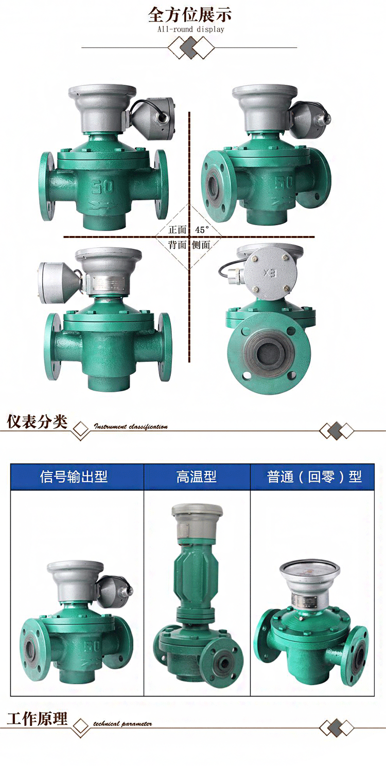 3、計(jì)量精度高,適用于高粘度介質(zhì)流量的測量,但不適用于含有固體顆粒的流體(固體顆粒會將齒輪卡死,以致無法測量流量)。如果被測液體介質(zhì)中夾雜有氣體時(shí),也會引起測量誤差。